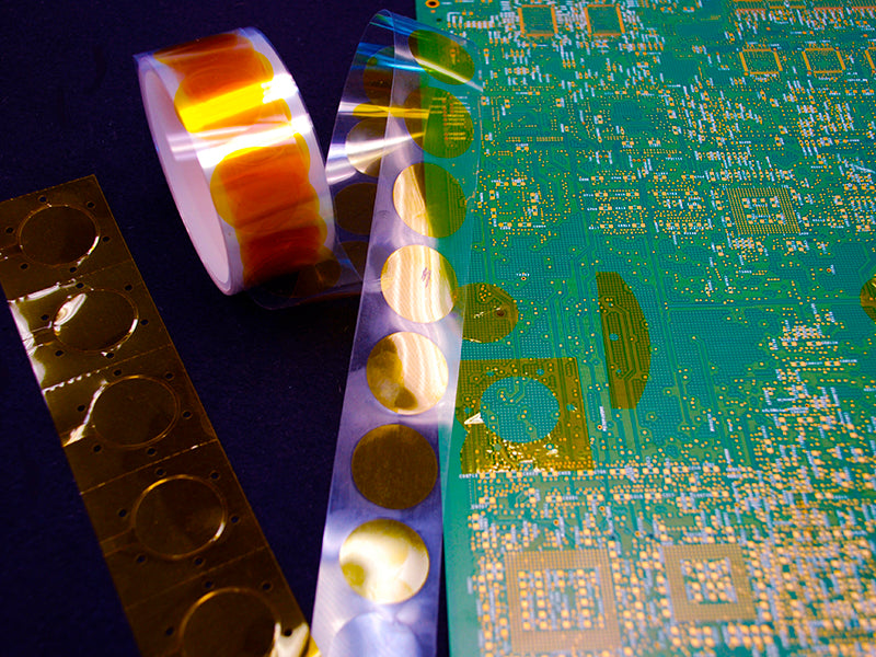 These discs/dots are manufactured from commercial grade polyimide film with a special silicone adhesive. The polyimide carrier is only 1 Mil, making this tape extremely conformable for irregular shapes and surfaces. Designed for high temperature masking found in conformal coating of PCBs, protection of gold fingers during circuit board soldering and electrical insulation of high temperature coils, motors and transformers.
